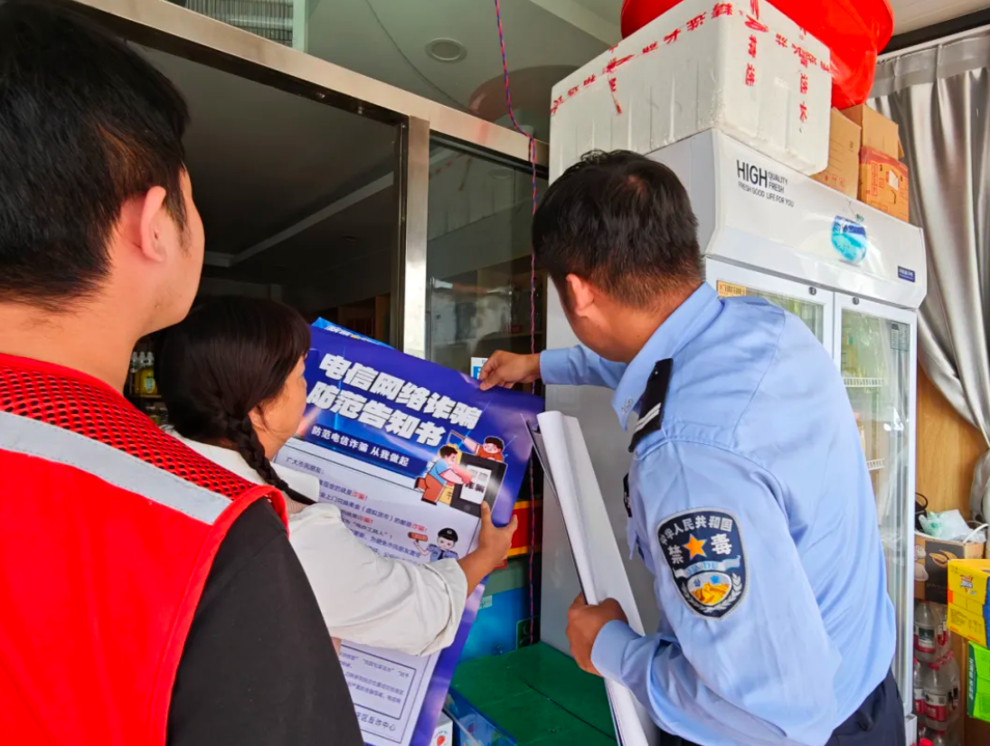 “国庆期间订单多,骗子就盯着商户忙的时候‘下套’!”在商铺集中的振兴路上,民辅警与社区工作人员挨家挨户敲门走访,不仅递上图文并茂的反诈手册,还结合近期高发的“冒充电商客服退款”“虚假订单催付款”等案例,用大白话拆解诈骗分子的套路。遇到正在理货的商户,民辅警还会手把手指导,将反诈彩页贴在收银台、玻璃门等显眼位置,让进店顾客也能看到国庆反诈提示,让每一家商铺都变成社区里的“反诈小驿站”。