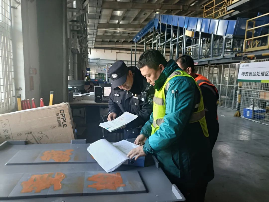 年关将近,寄递物流行业业务量骤增,为进一步推动“冬季行动”走深走实,苏银分局综合保税区派出所对辖区内寄递物流业进行安全检查,加强寄递物流行业监管力度,打击各类违法犯罪行为。