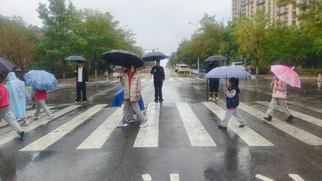 在各学校“护学岗”上,各执勤点民辅警冒雨穿梭于人群和车流中间,对家长接送车辆进行有序疏导,护送学生安全过马路,并时刻提醒驾驶人雨天注意安全、减速慢行,提醒每位接送学生的家长即停即走,车辆有序停放好,保障了学校门前及周边道路交通安全畅通,为广大师生出行撑起“平安伞”。