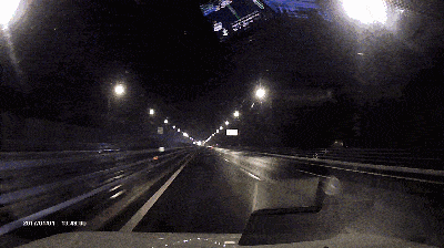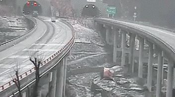☛ 雨天路滑,两车在桥梁弯道处相继侧滑失控。