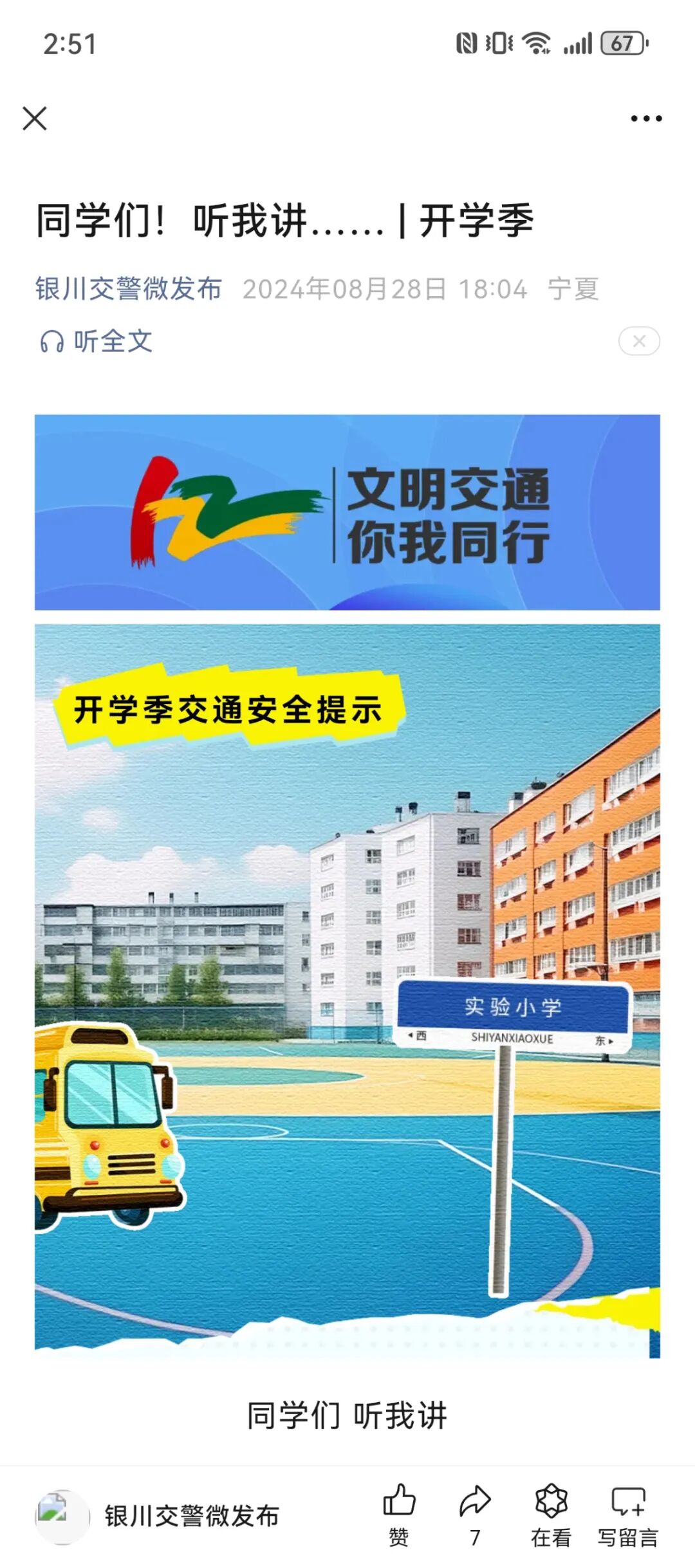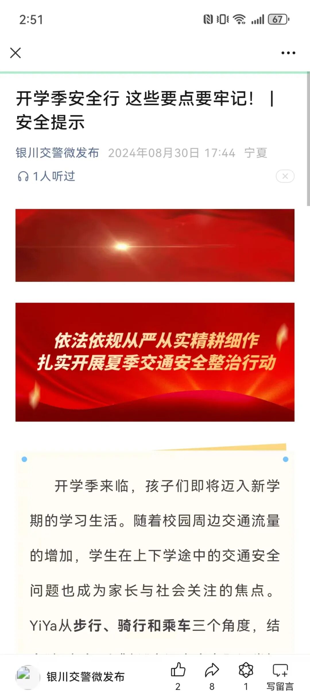 为进一步加强校园周边交通安全防范,减少和预防交通安全隐患,切实做好新学期校园交通安全工作,努力营造安全、和谐、稳定、有序的校园环境。银川交警以全市中小学、幼儿园护学岗为重点,动态增加治理重点路段,多措并举、多点发力,织密“安全网”、 站好“护学岗”,全力以赴为学子们保驾护航。