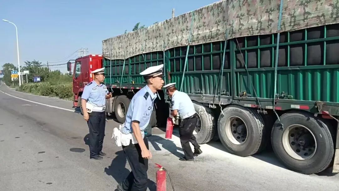 8月12日17时10分许,西夏区交警二大队教导员杨立军带队巡逻至110国道银巴路附近,突然听到“砰”地一声,循声看去,发现一辆半挂车停在307国道入口处,车辆后方轮胎冒着浓烟并伴有火苗,情况十分紧急。杨立军初步判断险情后,一方面安排执勤警力立即设置安全保护区域进行防护,一方面组织剩余警力利用灭火器第一时间对货车起火点火势进行扑灭,因救援及时,车辆所载货物未被火势引燃,及时制止了群众财产损失进一步扩大。