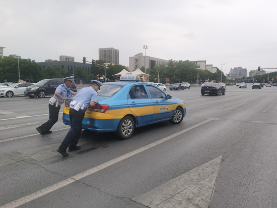 7月11日15时20分许,北京路与凤凰街路口东侧,正在巡逻的银川交警兴庆区一大队樊建军、高兴偶然发现东向西方向中间行车道上,有一辆出租车打着双闪,停在那里一动不动,车旁驾驶员万分焦急的打电话、检查车辆。后面的车辆绕道行驶。执勤民警迅速靠边停车,上前询问情况。