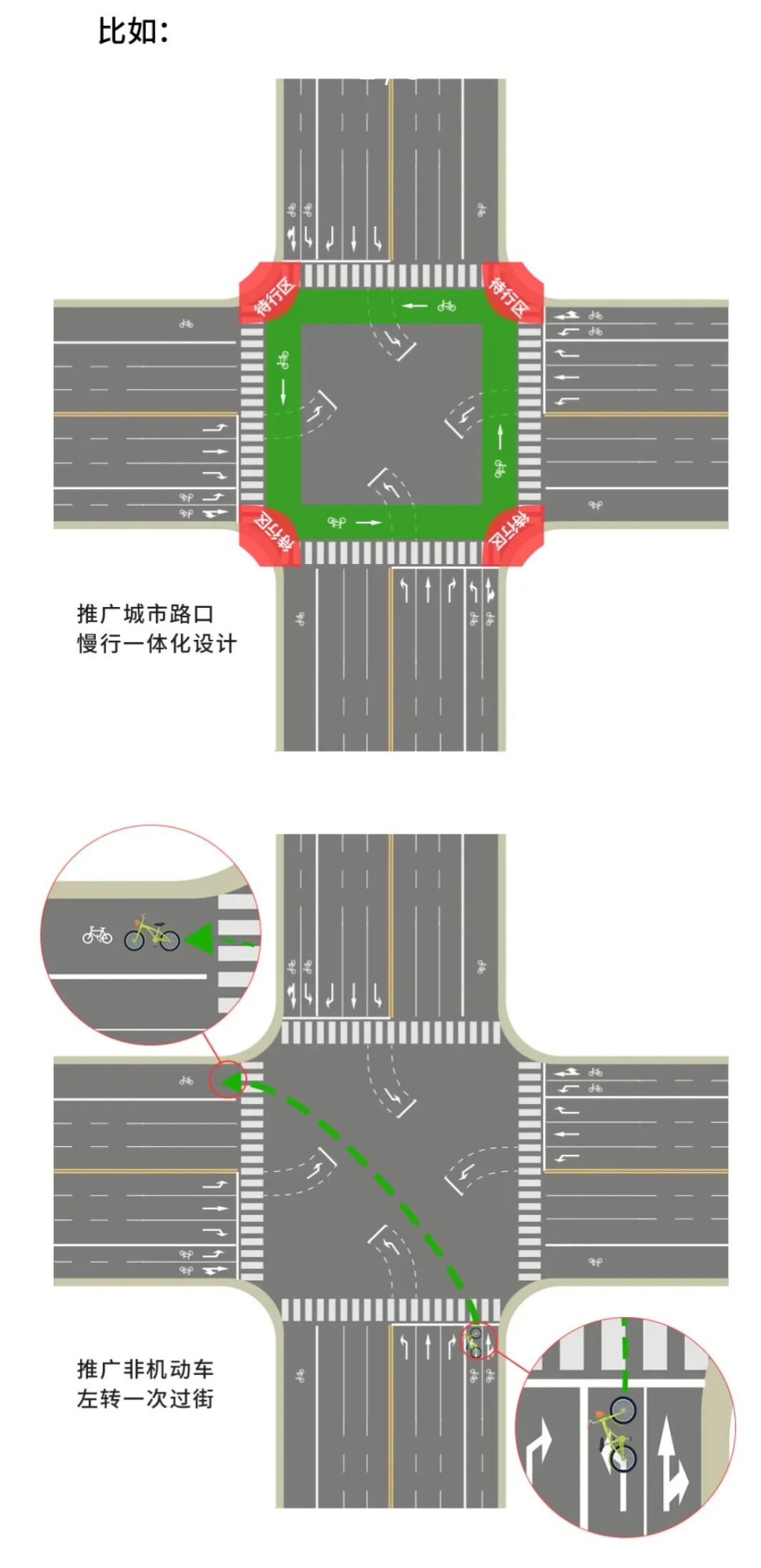 推广城市路口慢行一体化设计,拓展非机动车等候空间,科学设置机非隔离设施,引导非机动车有序等候、顺畅通过,减少通行干扰。具备条件的路口,推广非机动车左转一次过街措施,便利非机动车安全快捷通过,提升非机动车通行的连续性、舒适性和安全性。
