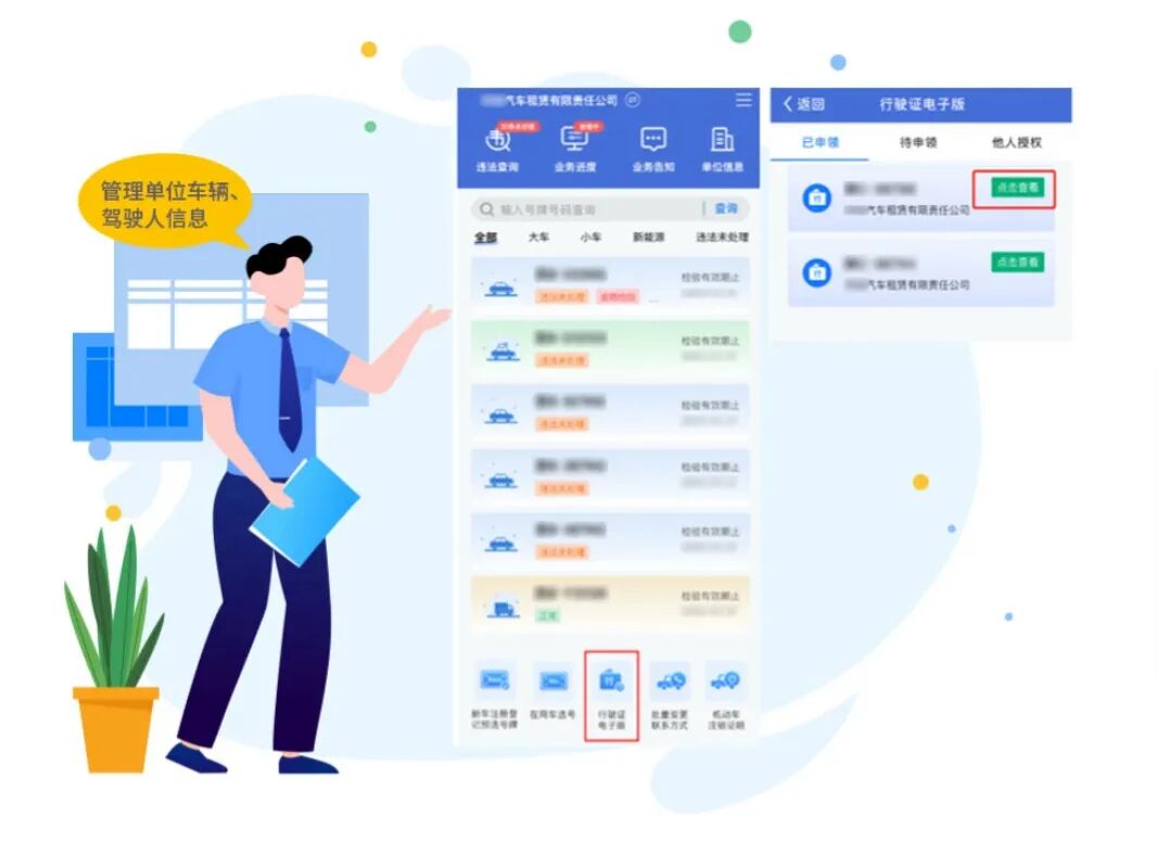 机关、企事业单位在属地公安交管部门开通账号后,可通过“交管12123”APP线上管理本单位名下车辆以及车辆备案驾驶人信息,查询车辆状态、交通违法记录等信息,在线办理车辆选号、补换领牌证、申领车辆免检标志、变更联系方式等业务,实现掌上办牌办证、掌上亮证亮码,降低办事成本,助力优化营商环境。