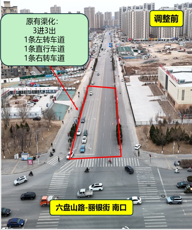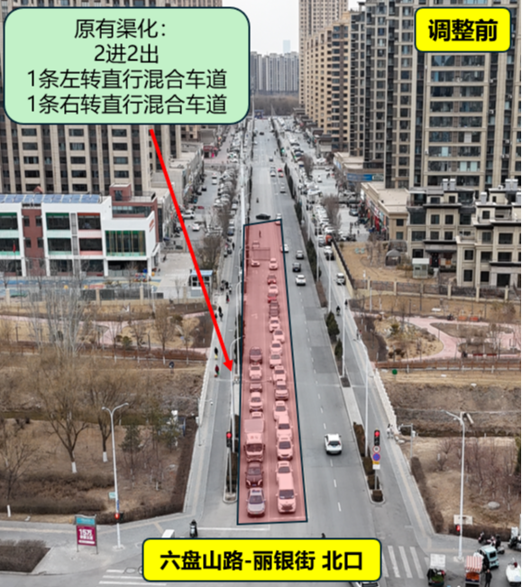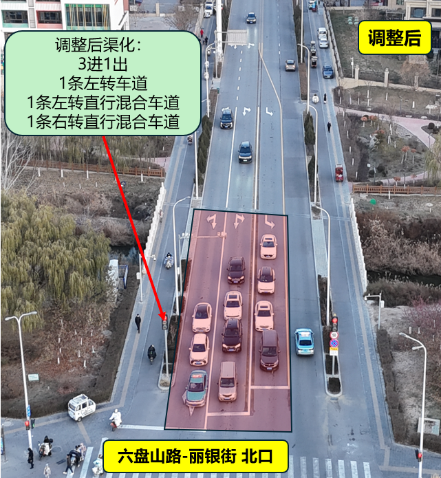 调整后渠化:3条进口车道+1条出口车道,进口车道为:1条左转车道、1条左转直行混合车道、1条右转直行混合车道。
