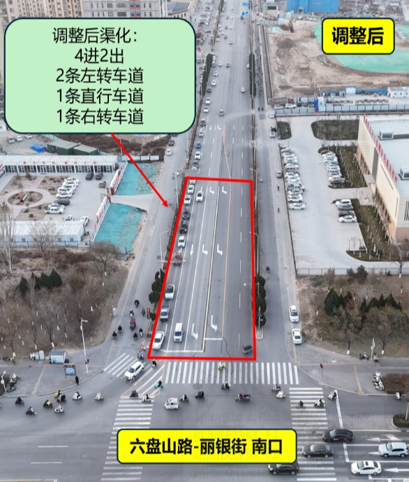 调整后渠化:4条进口车道+2条出口车道,进口车道为:2条左转车道、1条直行车道、1条右转车道。