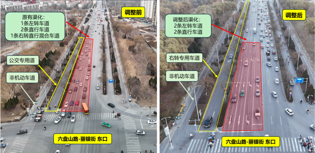 调整后渠化:2条左转车道、2条直行车道、1条右转专用车道(取消原有公交专用道)。