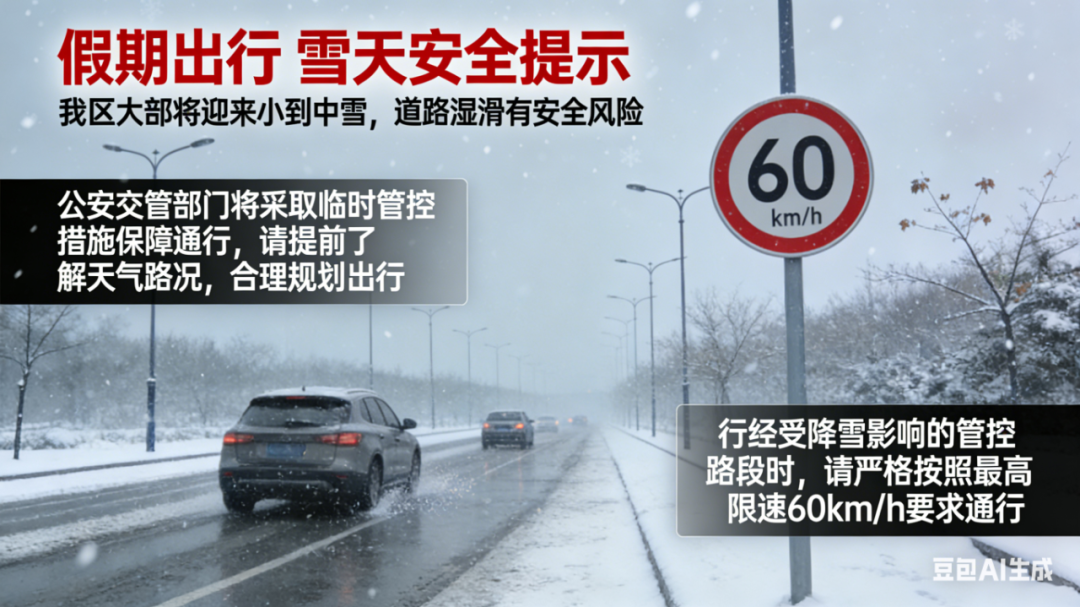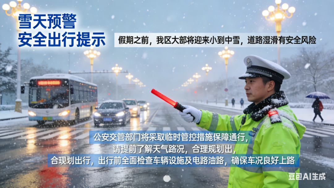 假期之前,我区大部将迎来一场小到中雪天气过程,道路湿滑存在安全风险,公安交管部门将结合铲冰除雪作业情况,对部分路段通过分车型放行、间断放行等临时管控措施保障通行秩序,请提前了解天气、路况等信息,合理规划出行路线和时间,避免耽误行程。出行前请对车辆进行全面检查,重点检查车辆的刹车、灯光、制动、灭火器、胎压等设施及电路、油路系统,确保车辆状况良好再上路行驶。