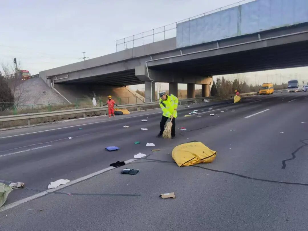 养护人员到达后,交警与养护工人分工协作,高效配合,迅速将洒落货物清理至安全区域,及时消除了路面安全隐患。随后,民警找到了焦急的快递车驾驶员,将货物完整归还,并对其进行了现场安全教育。