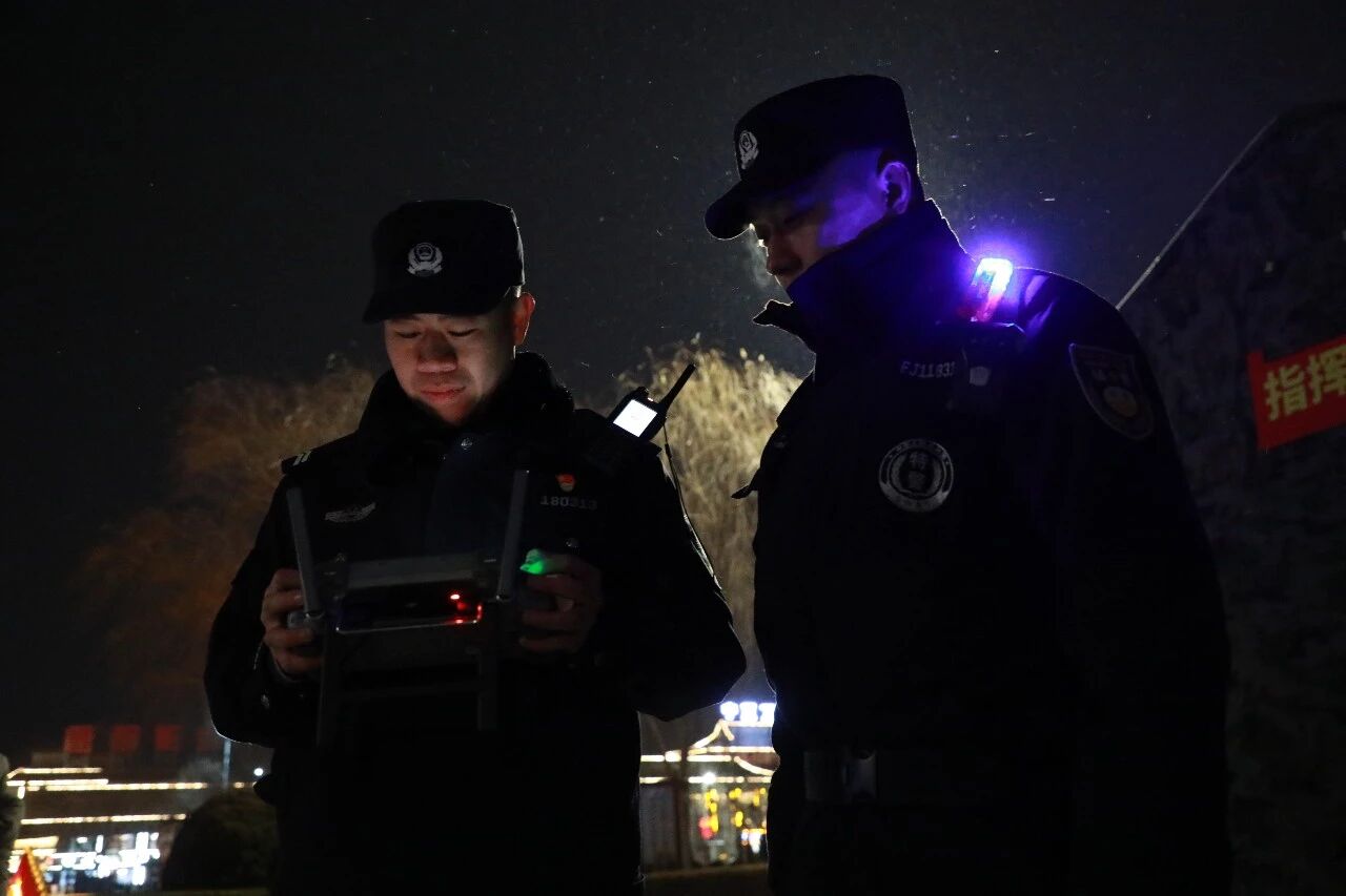 活动前夕,全体执勤民辅警提前到岗就位,按照既定方案开展安保工作。交通安全组在现场周边主要路口疏导交通,保障道路通行顺畅;现场安保组科学划分执勤区域,在演出区、水域周边等重点部位定点值守与动态巡逻相结合,引导群众有序观演;净空管制组运用无人机巡查空域,对活动现场“低慢小”“黑飞”的无人机进行反制管控,保障无人机表演顺利进行;突发事件处置组随时待命,确保突发情况快速响应。执勤人员同时热情回应群众咨询求助,文明规范执法,展现灵武公安良好风貌。