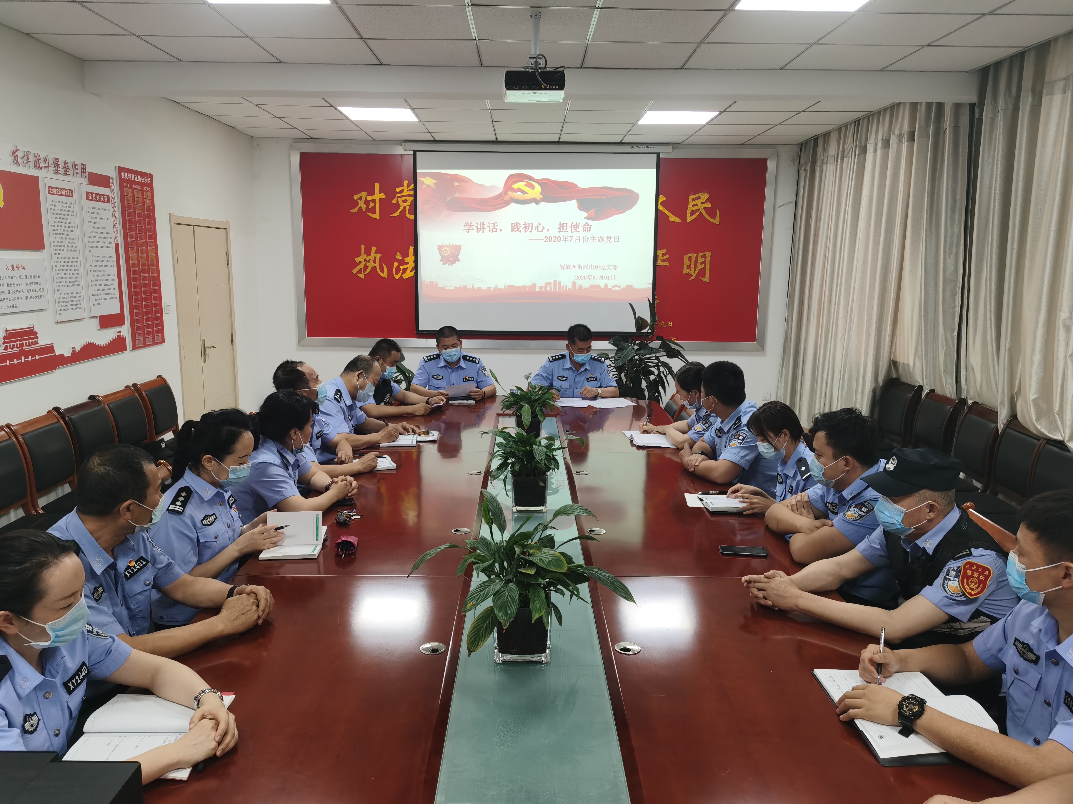 2020年7月1日下午,兴庆区公安分局解放西街派出所二楼会议室,铿锵的入党誓词声,隆隆入耳。在中国共产党建党99周年来临之际,解放西街派出所开展“学讲话,践初心,担使命”主题党日活动,活动由支部书记吴学林主持,来自所支部的民警、辅警、入党积极分子,共18人,参加活动。分局党委委员、局长助理张晓虎以普通党员身份参加党日活动。