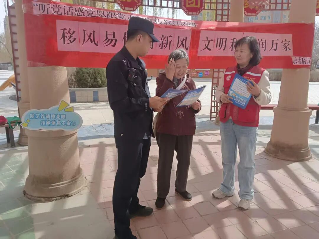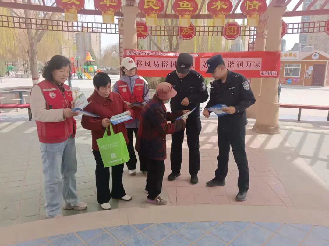 春风送暖,阳光正好。在永宁县永和锦城小区中心广场上,身着藏蓝警服的民警和身着红马甲的社区工作人员将一份份宣传资料递到居民手中。这是团结西路派出所永和社区警务室联合社区开展的“移风易俗树新风 文明和谐润万家”主题宣传活动现场。