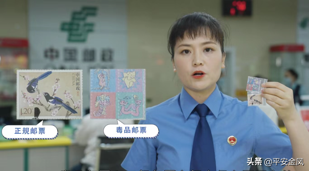 连云港市人民检察院一名检察官正在展示和讲解毒品“邮票”与正规邮票的区别。(连云港市人民检察院供图)
