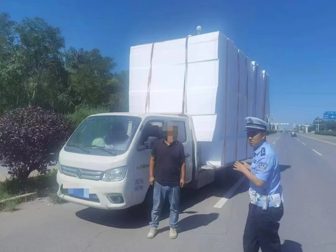 8月12日10时27分,永宁县公安局交警大队执勤民警在永宁109国道迎宾大道路口开展工作时,发现一辆号牌为宁AQ***E号轻型普通货车拉载的泡沫板严重超出车身长度、宽度、高度,且因泡沫板体积过大,存在严重的道路交通安全隐患。民警见状立即拦停车辆,随即示意其靠边停车接受检查。
