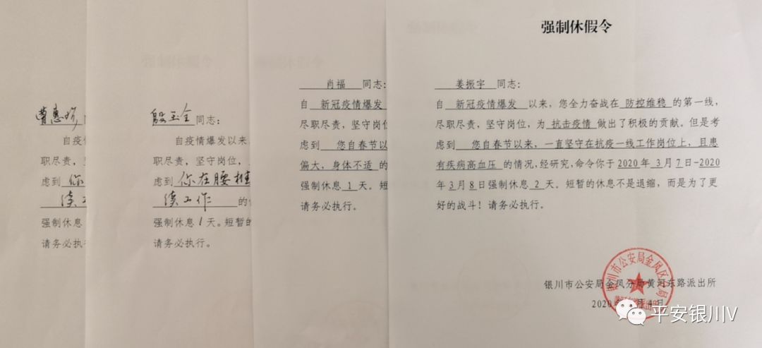 ☆ 建立健全民警辅警身体健康监测档案;对于患有严重疾病、不适应岗位工作需要的民警辅警,应当及时调整工作任务或工作岗位。对接银川市13家医院开通定点救治“绿色通道”。
