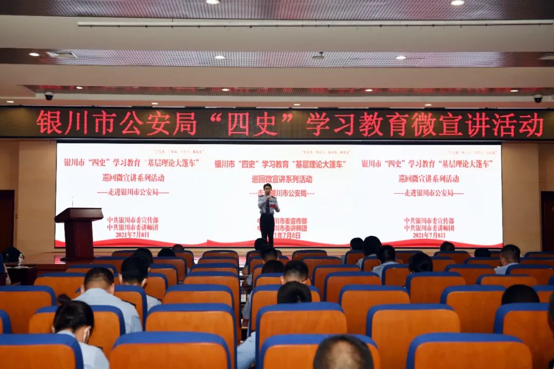 为进一步贯彻落实习近平总书记关于党史学习教育的重要指示精神,大力弘扬伟大建党精神,从党的百年奋斗历程中汲取智慧和力量,不断把党史总结、学习、教育、宣传引向深入,激发全体民辅警爱党爱国爱社会主义爱家乡的巨大热情,7月8日下午,银川市公安局举办党史、新中国史、改革开放史、社会主义发展史宣讲活动暨第三十五期“民警学堂”,特邀银川市“四史”学习教育“基层理论大篷车”巡回宣讲团来到银川市公安局作党史学习教育专题辅导,市局各部门民辅警代表参加此次活动。