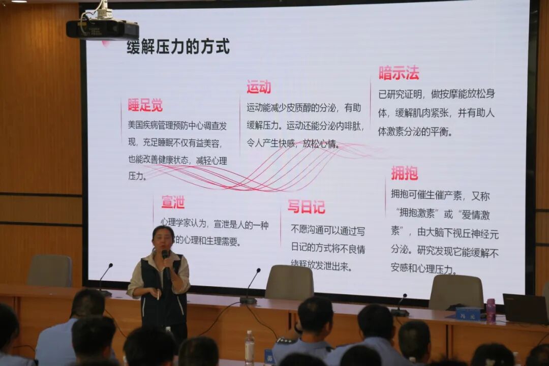 国家二级心理咨询师冯元老师采用"沉浸式体验+互动教学"的新模式,以如何缓解工作压力为切入点,全面剖析了民警辅警容易出现的心理问题,讲述了在工作高压的现状如何对减压、减负,传授自我调整的方式方法,帮助大家及时消除自我紧张、抑郁等心理障碍,引导大家调节思维、增强意志、释放压力,从而保持良好的情绪、积极的心态和健康的心理,引导警员们开启了一场心灵探索之旅。