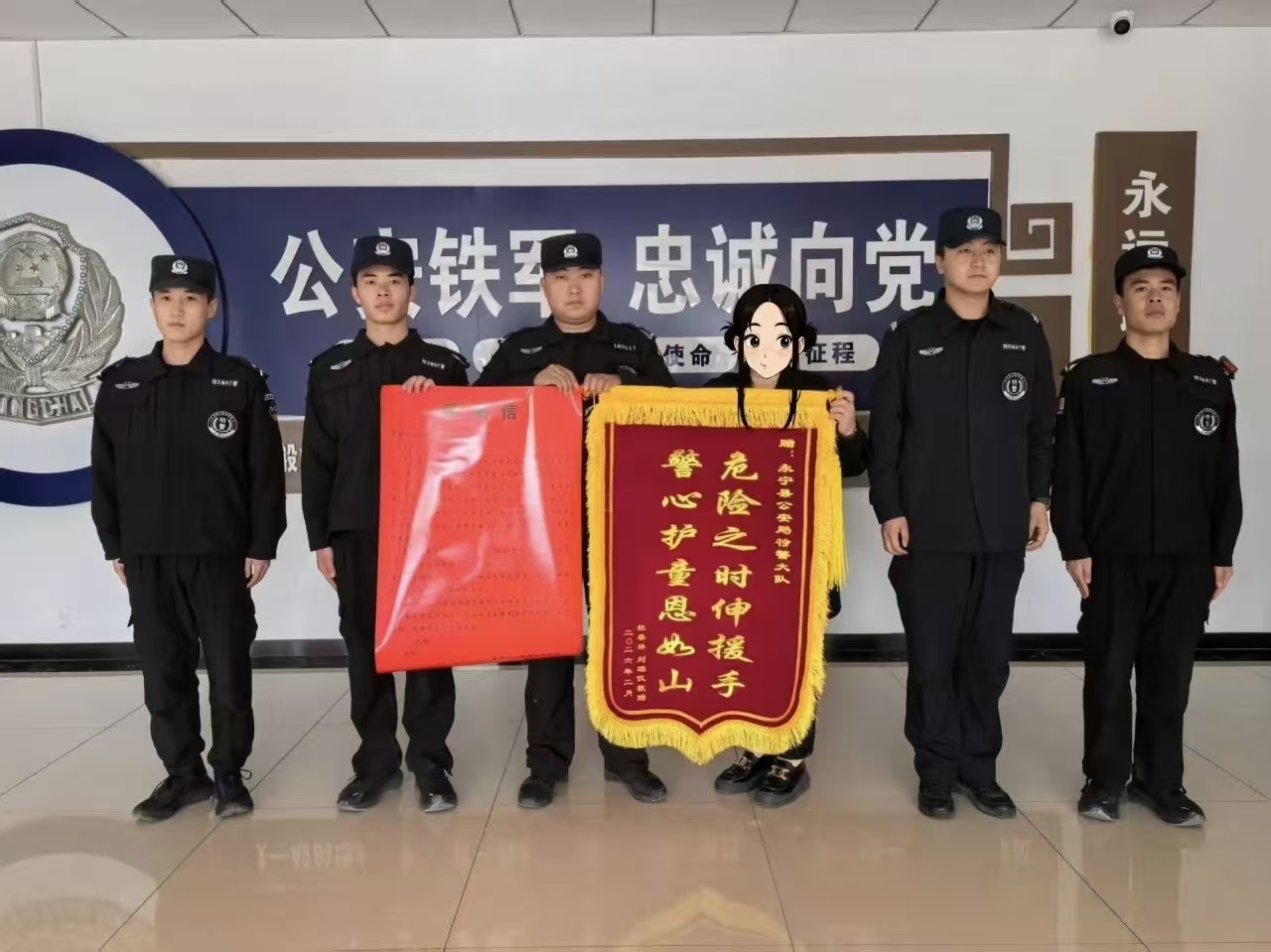 事后,孩子家属杜女士带着一面印着“危险之时伸援手,警心护童恩如山”的锦旗和一封饱含深情的感谢信来到永宁县公安局,感谢特警队员在孩子危难之际伸出援手。
