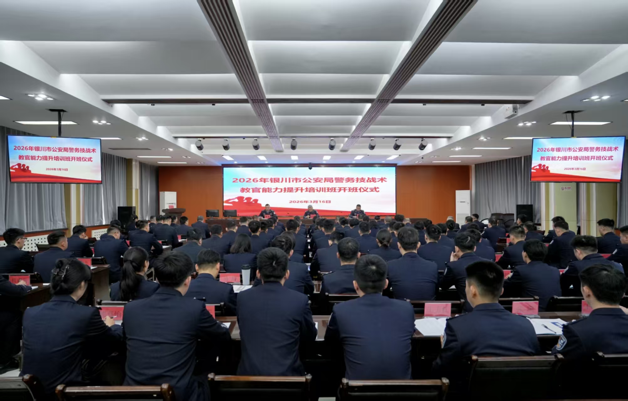 “教官队伍强,则基层训练强;基层训练强,则整体战斗力强。此次培训的新教官是未来全市教育训练的火种,要真正把训练的担子挑起来,把实战的本领传下去。”3月16日上午,全市公安机关警务技战术教官能力提升培训班开班仪式在宁夏警官职业学院举行,银川市公安局党委委员、政治部主任张怀志出席仪式并作动员讲话。各县(市)局、分局政工部门负责同志,局属相关部门分管政工工作负责同志以及72名警务技战术教官后备人选参加仪式。