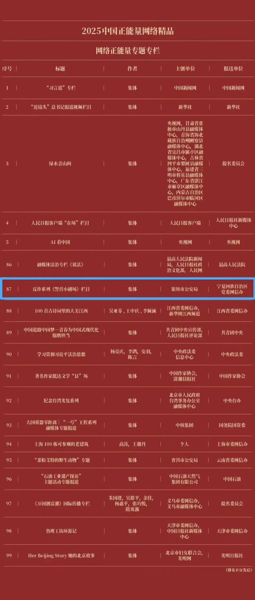 更让人眼前一亮的是银川公安自编自导自演的反诈系列《警营小剧场》。以真实案例做骨,幽默剧情做翼,硬核的反诈知识被装进了网感十足的情景短剧里。自《警营小剧场》开播以来,全网播放量突破1.1亿,2026年还成功入选中国正能量网络精品——这也是宁夏公安机关唯一获此殊荣的作品。