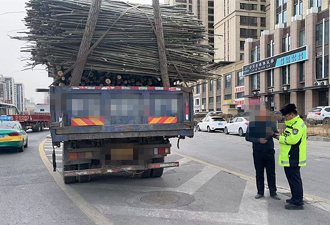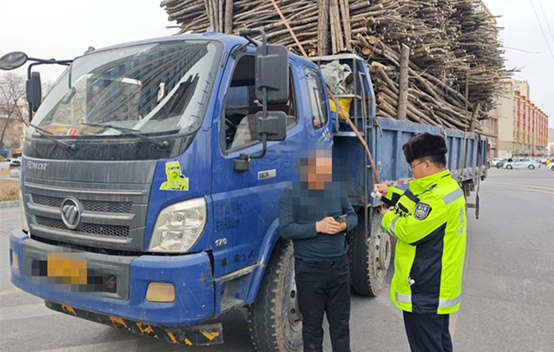2月18日,银川交警巡逻时发现了一辆轻型货车满载着木材,严重超高且车身向右侧倾斜,存在安全隐患。执勤民警见状,立即示意其靠边停车。
