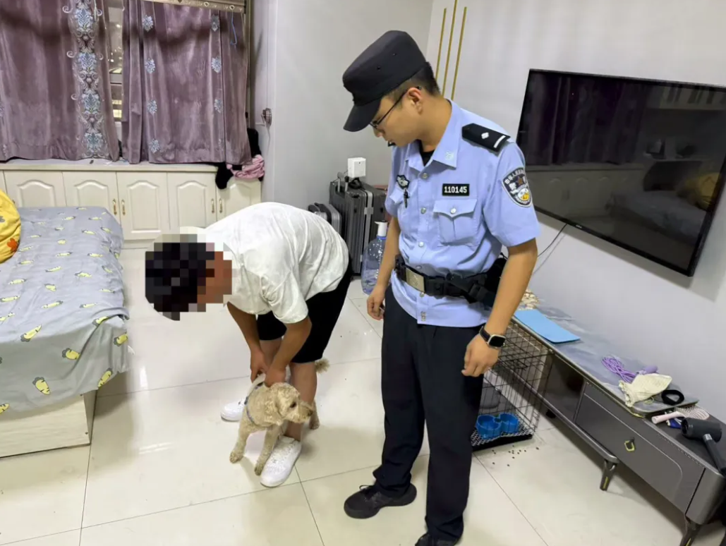 民警安置好狗狗后,通过社区警务微信群、辖区商户联络群发布狗狗的照片和特征信息,发动群众共同帮忙寻找主人。2 个小时后,接警电话突然响起,一名男子在电话中焦急地说:“警察同志,我的泰迪狗丢了!戴着棕色项圈,下午我出门后它好像自己跑出去了,麻烦你们帮忙找找!” 经过逐一核对,男子描述的狗狗特征与留在派出所的泰迪犬完全吻合,丢失时间也与狗狗进入派出所的时间线基本一致。为进一步确认,民警还让男子通过微信发送了狗狗的日常照片,对比后确认二者就是同一只狗。随即民警询问男子地址后,牵着狗狗来到男子家中,经过辨认狗狗确系男子丢失的宠物狗。