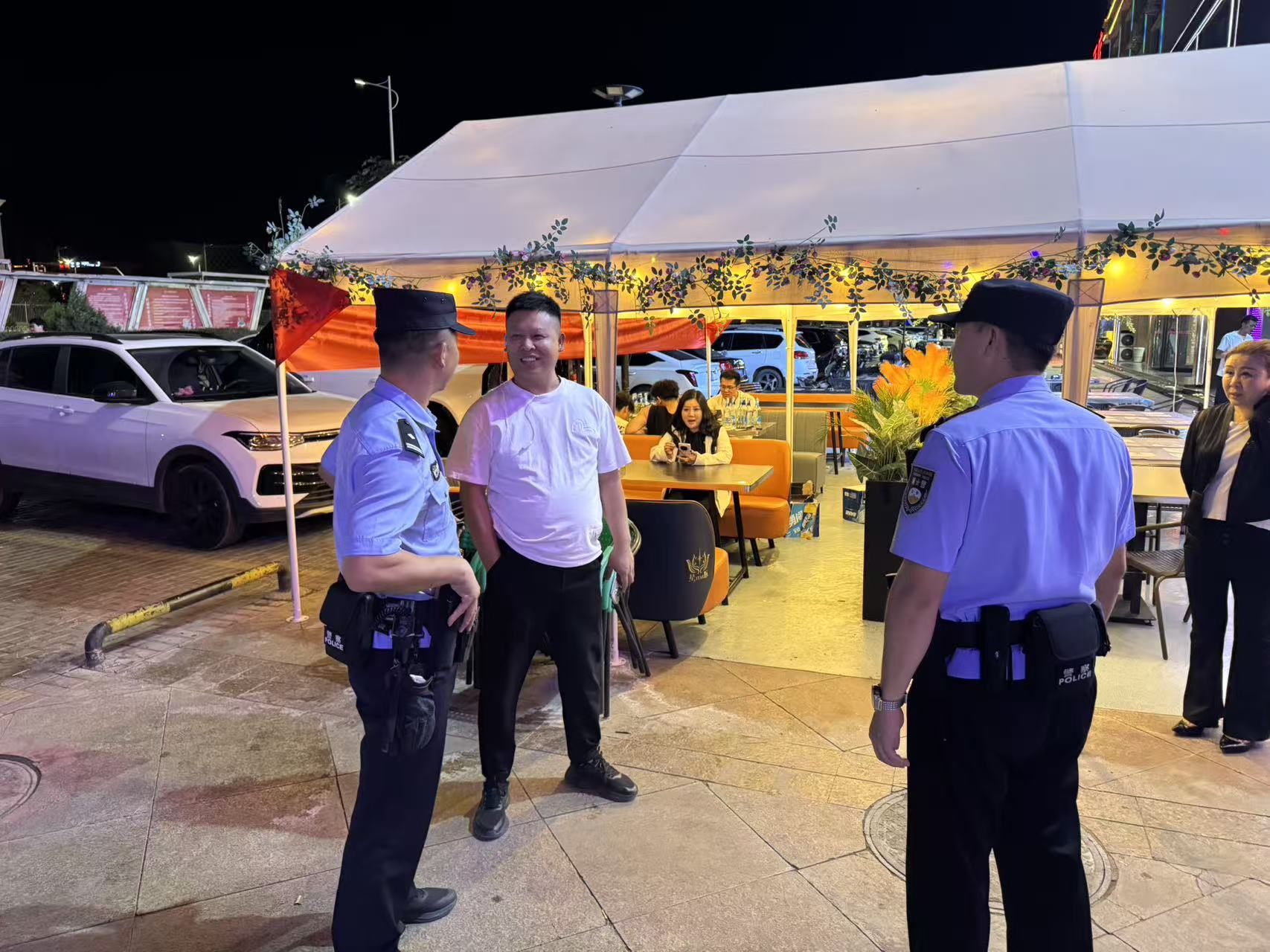 “老板,最近生意怎么样?店里的监控设备都正常运行吗……”在一家烧烤摊前,民警梁超林停下脚步,与摊主亲切交流,询问着近期的安全情况,同时提醒摊主增强安全防范意识,妥善保管贵重物品。